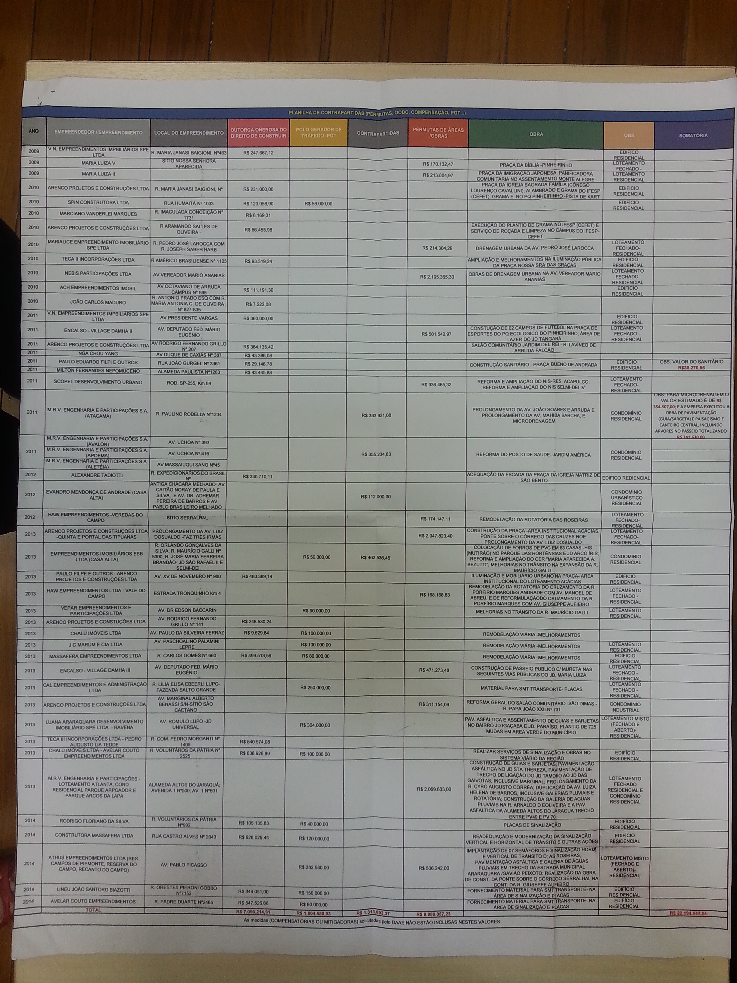 Assunto: Requer seja oficiado ao Senhor Prefeito Municipal, solicitando-lhe que seja enviado os valores pagos e obras realizadas em contrapartida por todos os empreendimentos imobiliários tais como: condomínios, prédios e loteamentos de 2005 à 2014.}